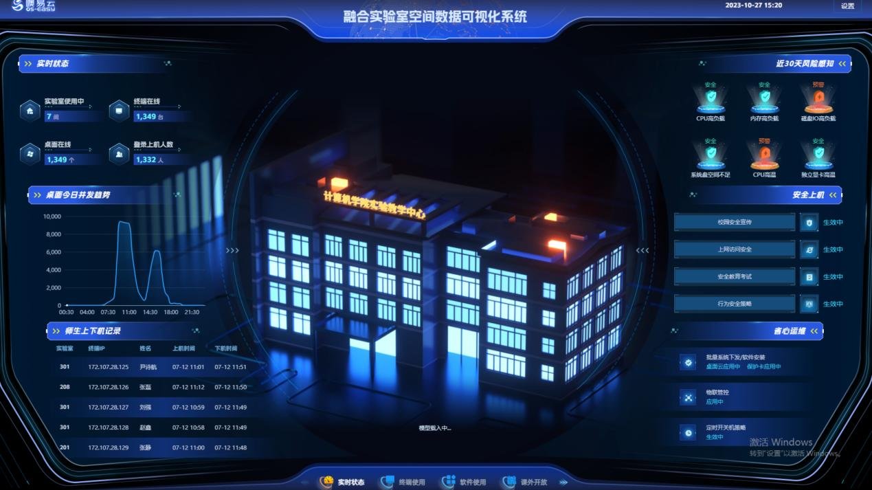 大屏可視化展示:通過(guò)一樓大屏實(shí)時(shí)呈現(xiàn)上機(jī)人數(shù)、實(shí)驗(yàn)室占用率、課程排課情況等核心數(shù)據(jù),成為參觀交流的核心展示載體。