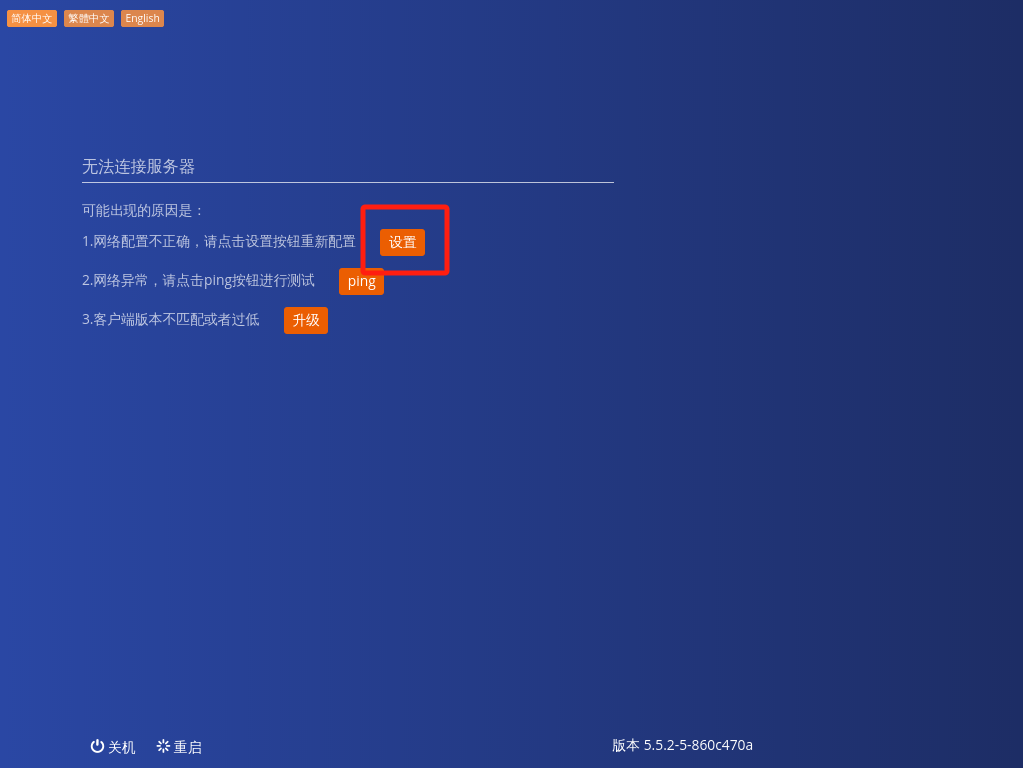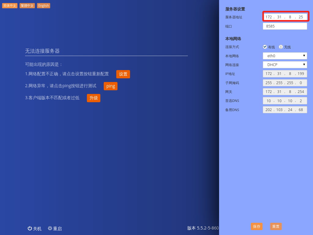 7、重啟后,出現(xiàn)以下畫面,點(diǎn)擊設(shè)置,填入服務(wù)器的IP,網(wǎng)絡(luò)連接選擇有線,IP地址填入原地址即可,可以在管理平臺上查看,或者打開左邊右邊的終端設(shè)置看下,推測下這臺終端的IP,掩碼、網(wǎng)關(guān)、DNS跟其他終端一致即可。