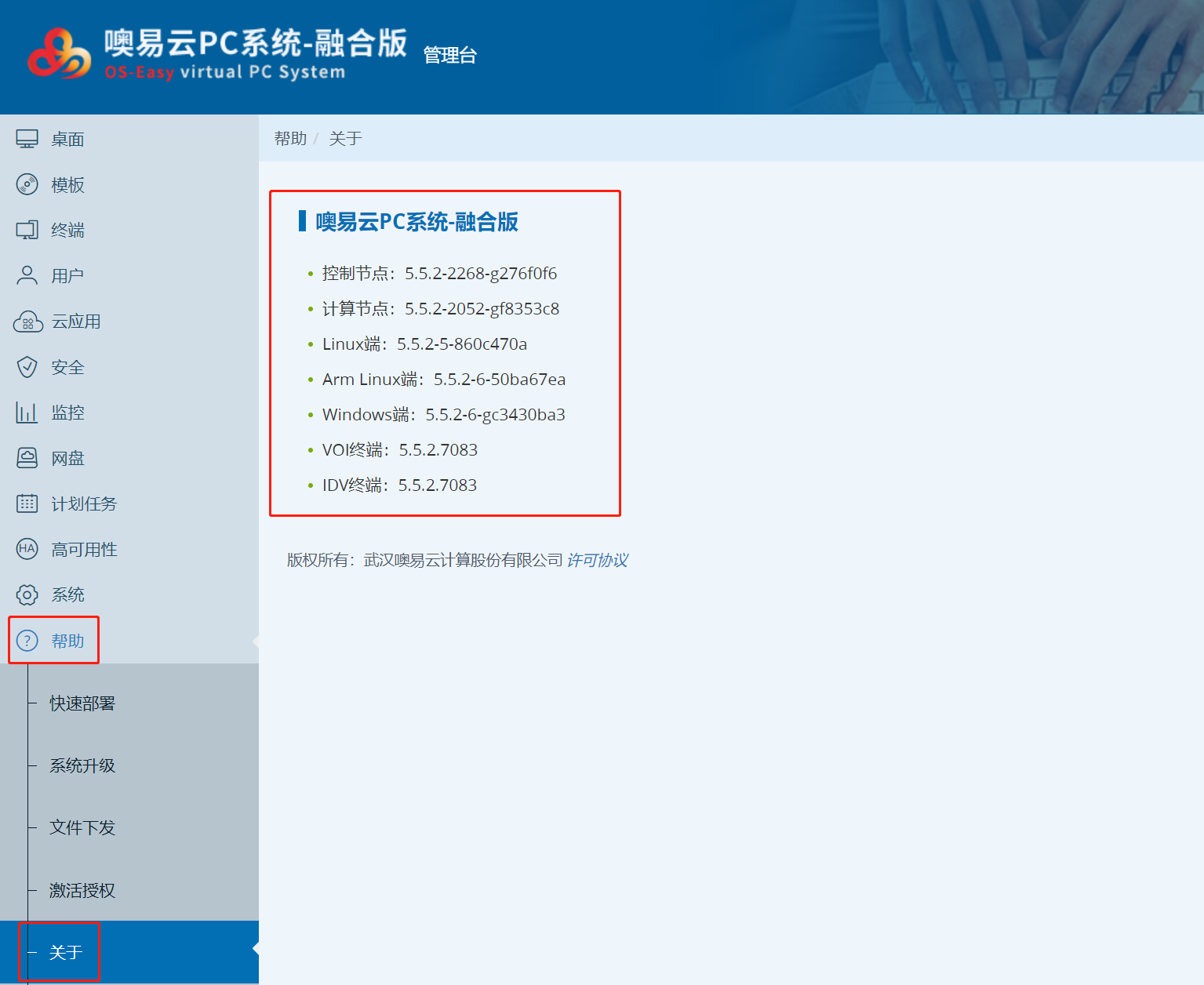 在安裝客戶端之前需要先確認(rèn)客戶端的版本號,在管理平臺上點(diǎn)擊幫助-關(guān)于,這里會(huì)顯示當(dāng)前服務(wù)端對應(yīng)的客戶端版本號。