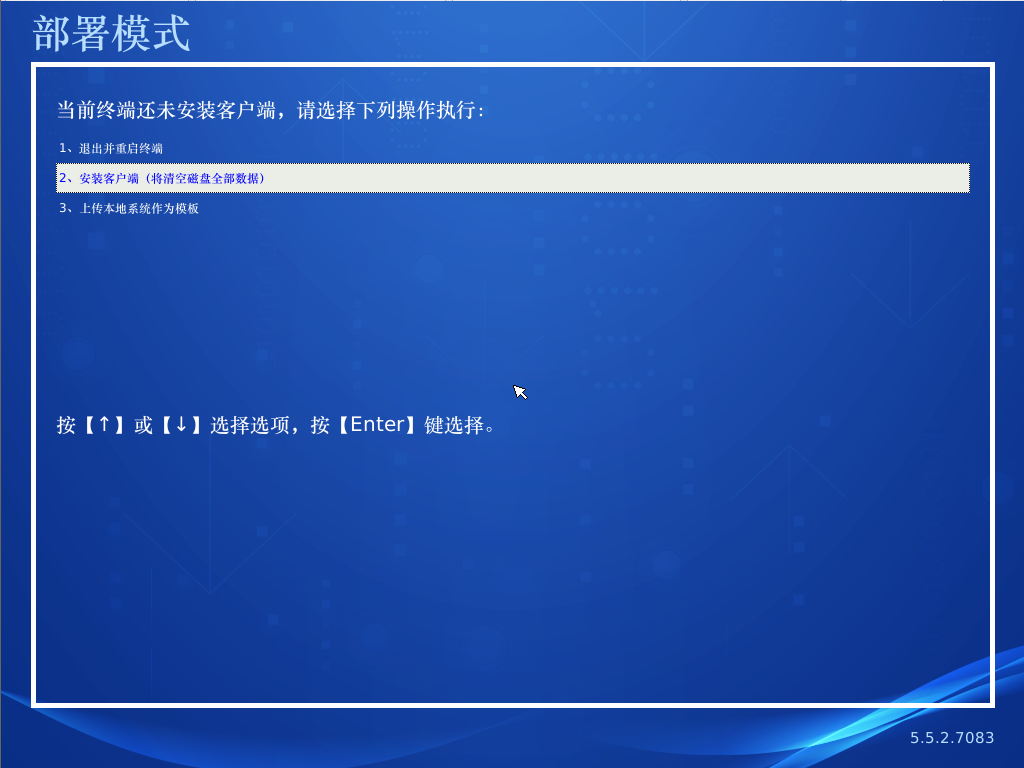 3、從U盤啟動(dòng)后,選擇簡(jiǎn)體中文,進(jìn)入部署模式如圖,選擇2安裝客戶端(會(huì)清除磁盤全部數(shù)據(jù)請(qǐng)?zhí)崆白龊脗浞荩c(diǎn)擊確定。