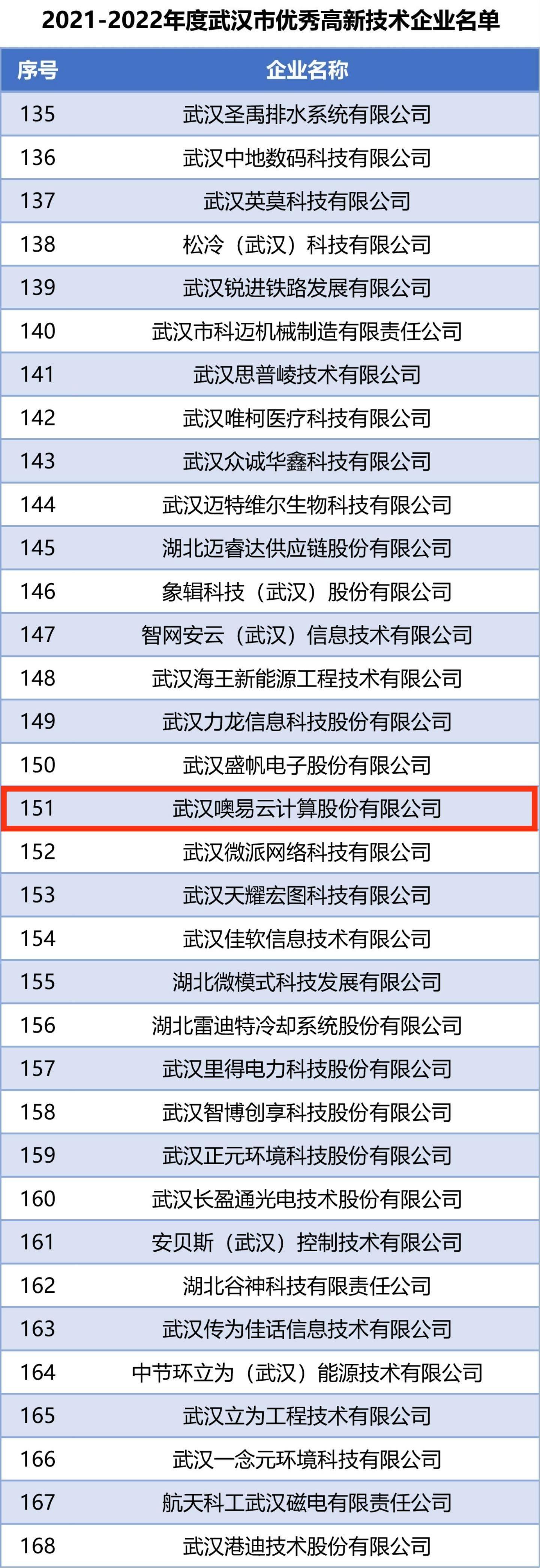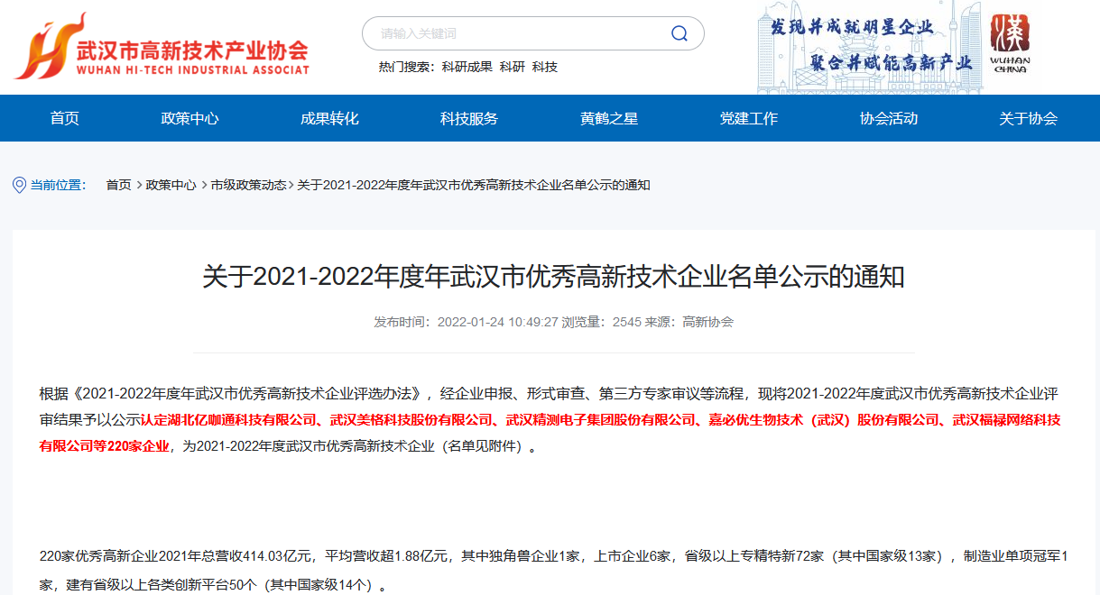 2021-2022年度年武漢市優(yōu)秀高新技術(shù)企業(yè)公示名單(圖)
