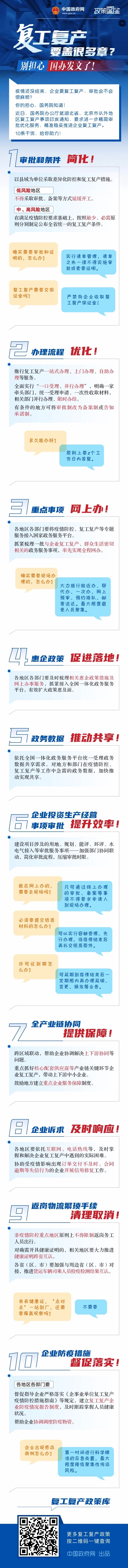 近日,國(guó)務(wù)院辦公廳就湖北省、北京市以外地區(qū)復(fù)工復(fù)產(chǎn)事項(xiàng)印發(fā)通知,要求進(jìn)一步精簡(jiǎn)審批優(yōu)化服務(wù),精準(zhǔn)穩(wěn)妥推進(jìn)企業(yè)復(fù)工復(fù)產(chǎn)。