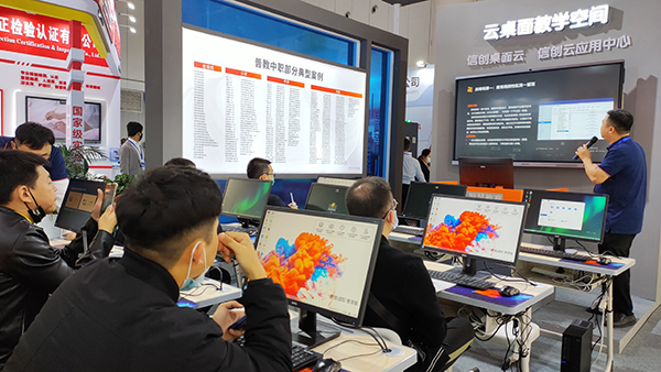 云實(shí)訓(xùn)室教學(xué)產(chǎn)品現(xiàn)場展示并進(jìn)行熱烈討論(圖) (云實(shí)訓(xùn)室展示區(qū)交流熱烈,云教室系統(tǒng)在各場景中的應(yīng)用得到專家和領(lǐng)導(dǎo)的認(rèn)可) 四、 信創(chuàng)云辦公,打造可信安全的教學(xué)辦公環(huán)境(加快國產(chǎn)化替代進(jìn)程) 教育部等六部門印發(fā)《關(guān)于推進(jìn)教育新型基礎(chǔ)設(shè)施建設(shè)構(gòu)建高質(zhì)量教育支撐體系的指導(dǎo)意見》,意見提出將可信安全新型基礎(chǔ)設(shè)施作為教育重點(diǎn)發(fā)展方向之一。目前, 信創(chuàng)產(chǎn)業(yè)主要產(chǎn)品和核心技術(shù)已經(jīng)實(shí)現(xiàn)了從“不可用”向“基本可用”的轉(zhuǎn)變,并且正在向“好用易用”大跨步邁進(jìn),面臨國產(chǎn)終端替代難題,采用桌面云技術(shù)是實(shí)現(xiàn)國產(chǎn)終端替代過程的最佳方案。 此次展會(huì)上,噢易云全面展示 信創(chuàng) 云辦公、信創(chuàng)云桌面教學(xué)空間、 信創(chuàng)云應(yīng)用三大產(chǎn)品方案。其中,噢易信創(chuàng) 融合桌面云平臺(tái)支持各類國產(chǎn)芯片設(shè)備,承載國產(chǎn)操作系統(tǒng),通過云應(yīng)用技術(shù)全面適配兼容各類軟件應(yīng)用,根據(jù)不同崗位的差異化需求,按需配置桌面,為用戶提供高安全、高穩(wěn)定、高性能的云桌面辦公環(huán)境,構(gòu)筑安全、敏捷、高效的 信創(chuàng)辦公應(yīng)用生態(tài),全面滿足中小學(xué)計(jì)算機(jī)云課堂教學(xué)、教師 云辦公等多場景應(yīng)用需求。