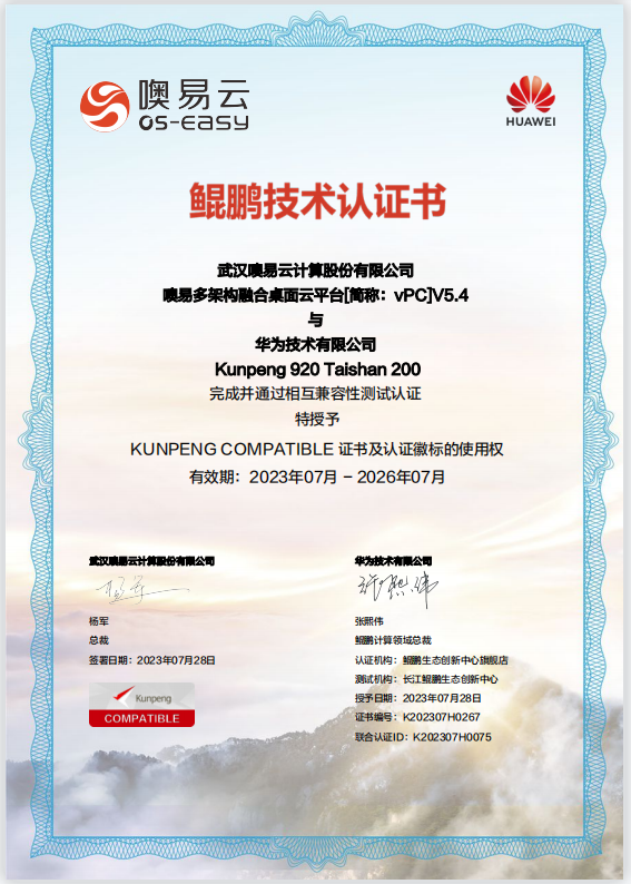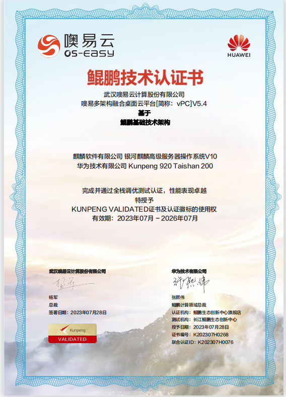 信創(chuàng)實力突破!噢易云多架構(gòu)融合桌面云平臺獲華為鯤鵬技術(shù)認證