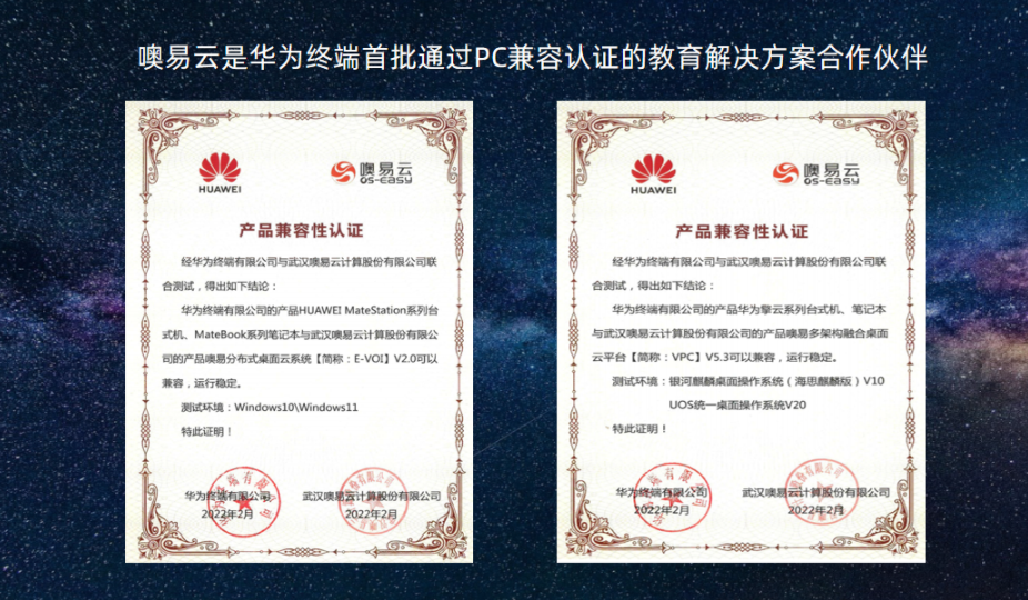 噢易云作為華為終端政企業(yè)務(wù)的重要合作伙伴,雙方已進(jìn)行產(chǎn)品兼容性認(rèn)證。華為擎云系列和HUAWEI MateStation系列終端已完成與噢易多架構(gòu)融合桌面云平臺(tái)、噢易分布式桌面云系統(tǒng)產(chǎn)品認(rèn)證,一方面滿足不同行業(yè)客戶多元化的應(yīng)用需求,加速終端數(shù)字化進(jìn)程,另一方面,雙方共同推進(jìn)國產(chǎn)化生態(tài)體系建設(shè),構(gòu)建規(guī)范、高效、共贏的合作生態(tài)。