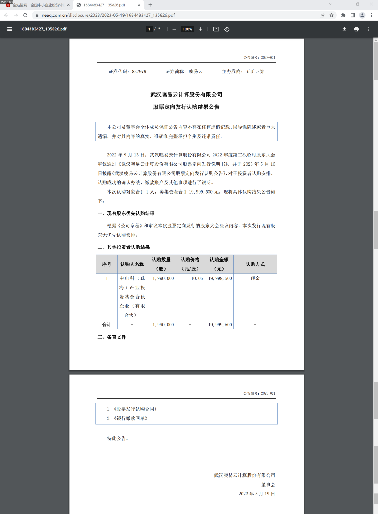 2023年5月19日,武漢噢易云計算股份有限公司在全國中小企業(yè)股份轉讓系統(tǒng)發(fā)布[臨時公告]噢易云:股票定向發(fā)行認購結果公告。