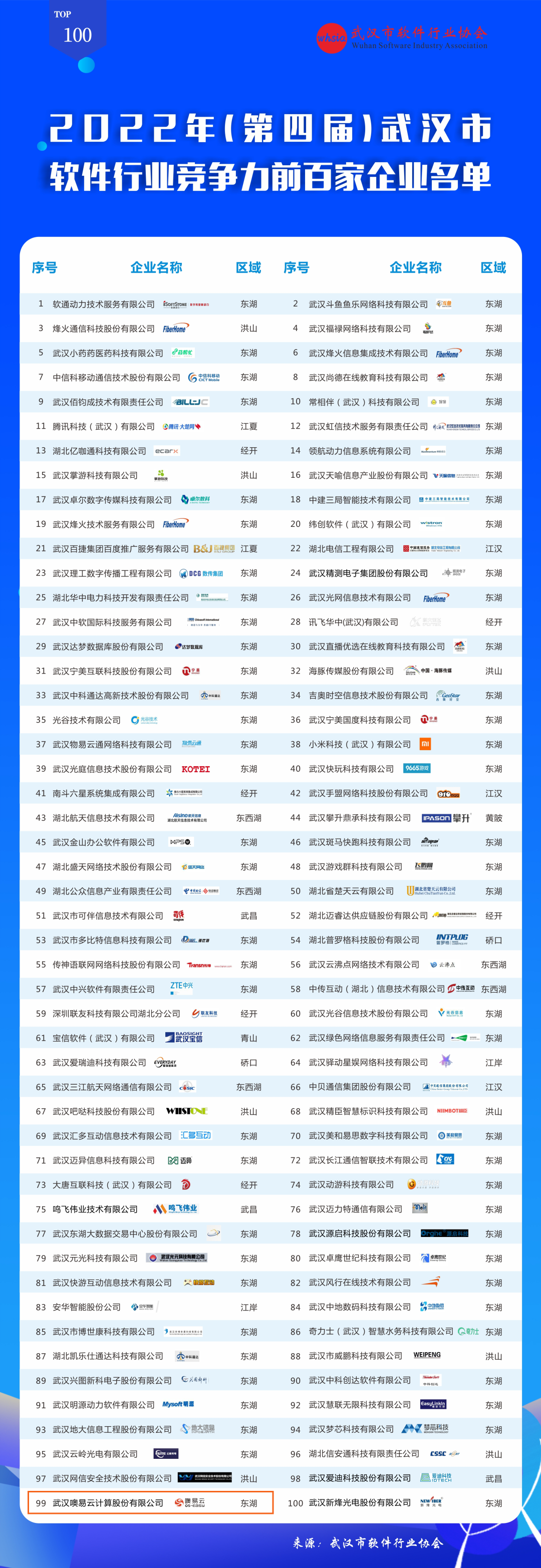 2022年武漢市軟件百強(qiáng)企業(yè)榜單
