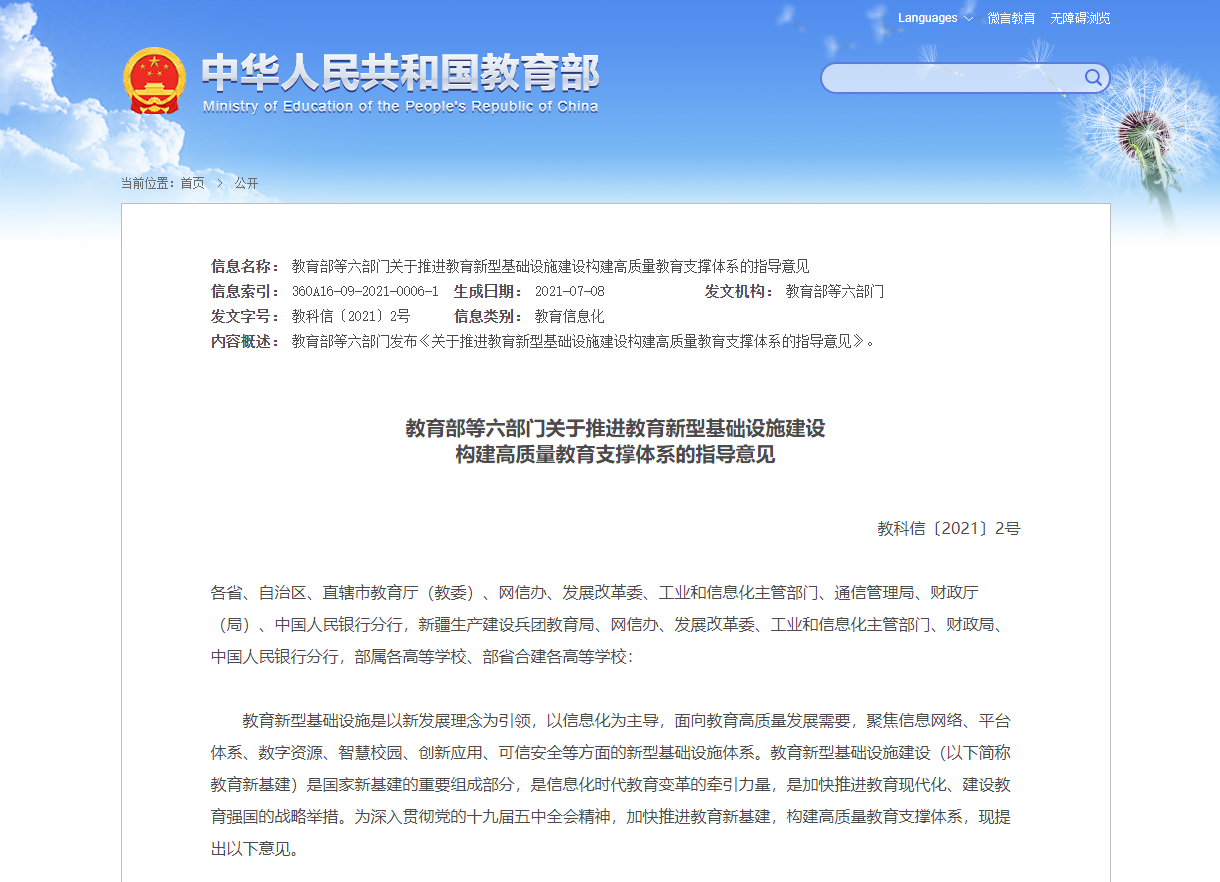 隨著信息技術(shù)的飛速發(fā)展,物聯(lián)網(wǎng)、云計(jì)算等新信息技術(shù)對(duì)教育產(chǎn)生重要影響。2021年,教育部、中央網(wǎng)信辦等6部門聯(lián)合發(fā)布《關(guān)于推進(jìn)教育新型基礎(chǔ)設(shè)施建設(shè)構(gòu)建高質(zhì)量教育支撐體系的指導(dǎo)意見(jiàn)》,首次提出“教育新基建”,要求建設(shè)“互聯(lián)網(wǎng) 教育”大平臺(tái),推動(dòng)教育與數(shù)字化技術(shù)深度融合,為教育信息化的發(fā)展注入強(qiáng)心劑。