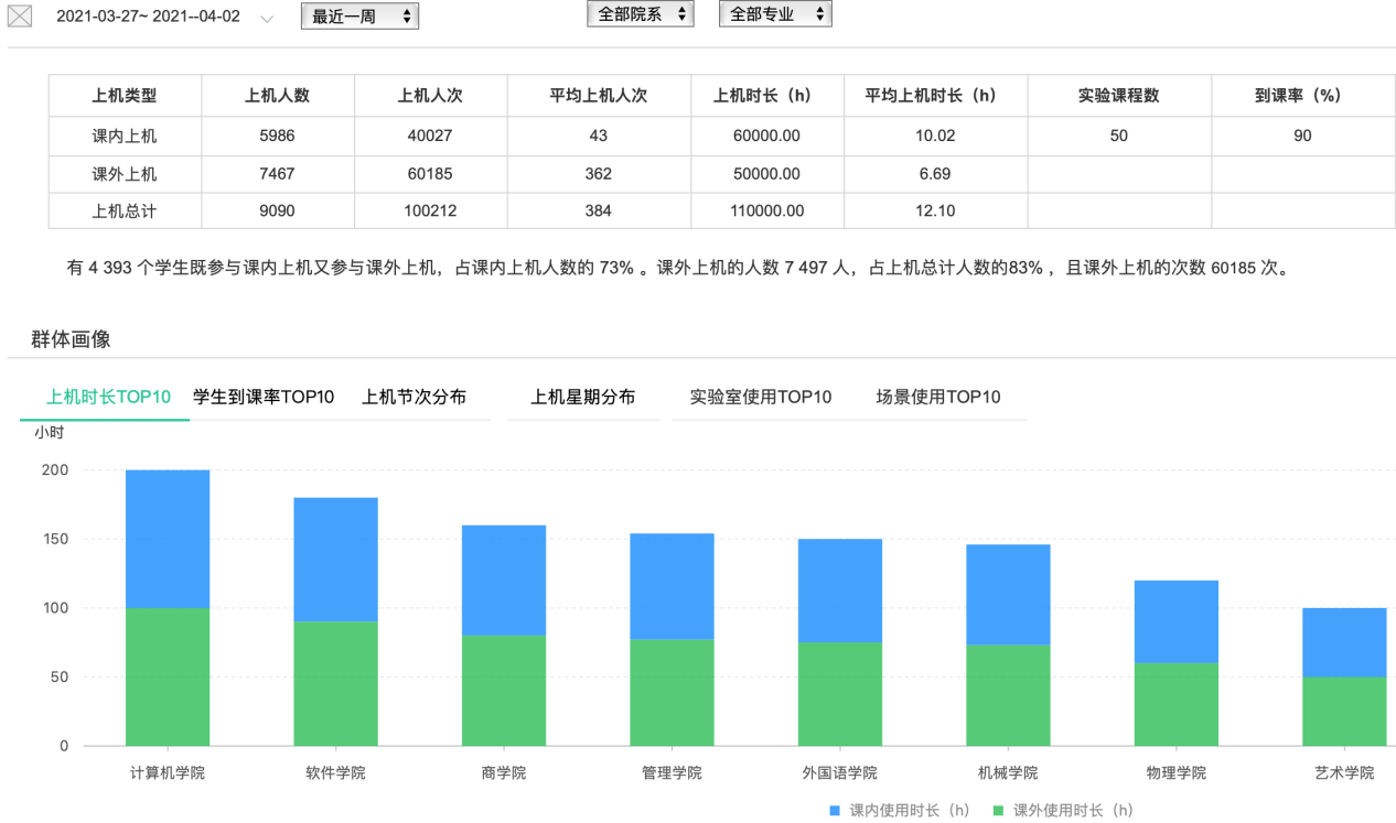 教學(xué)質(zhì)量分析報(bào)告:輸出考勤分析報(bào)告、實(shí)驗(yàn)教學(xué)課堂分析報(bào)告、群體上機(jī)畫像分析報(bào)告,檢閱學(xué)生培養(yǎng)效果,評(píng)估課程設(shè)置合理性,調(diào)整教學(xué)內(nèi)容;
