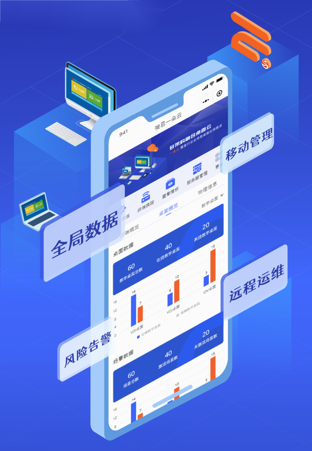首發(fā)“噢易一朵云”微信小程序,專為教育用戶量身打造,用戶可以通過手機遠程管理多架構(gòu)(VDI/VOI/IDV)融合桌面云,讓遠程管理無處不在。 用戶在微信小程序上搜索“噢易一朵云”,輸入授權(quán)賬號信息登錄,即可通過手機直接管理幾十間實驗機房,上千臺教學終端,上萬個不同專業(yè)的教學桌面云環(huán)境;實時查看實驗機房、教學終端、教學環(huán)境在線情況、終端設(shè)備啟動狀態(tài)等情況,所有數(shù)據(jù)一目了然,實驗室全局數(shù)據(jù)實時掌控。 上下課時,老師通過手機進行遠程開關(guān)機,遇到臨時考試、調(diào)課、實踐項目等緊急事件,通過手機創(chuàng)建 云桌面,完成教學環(huán)境部署,快速響應(yīng)、滿足臨時需求;當實驗室出現(xiàn)資源滿載、網(wǎng)絡(luò)上傳下載速度異常等問題時,手機端風險提醒信息第一時間微信推送,隨時隨地在線管理,讓管理更便捷,讓運維更高效。