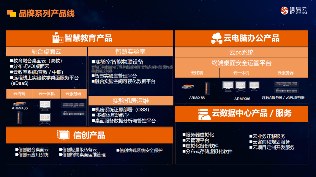 01 完備的軟硬件產(chǎn)品矩陣,實(shí)力構(gòu)建核心壁壘 噢易云作為專業(yè)的 桌面云方案提供商,緊跟國(guó)家發(fā)展戰(zhàn)略,通過云計(jì)算、桌面云服務(wù)、智能物聯(lián)網(wǎng)、邊緣計(jì)算等前沿技術(shù)的研發(fā)和技術(shù)創(chuàng)新,為教育、政府、企業(yè)、醫(yī)療、金融、能源等行業(yè)用戶提供 云電腦辦公、智慧教育、 信創(chuàng)桌面云等系列產(chǎn)品,以及行業(yè)深度融合的全場(chǎng)景一體化解決方案。