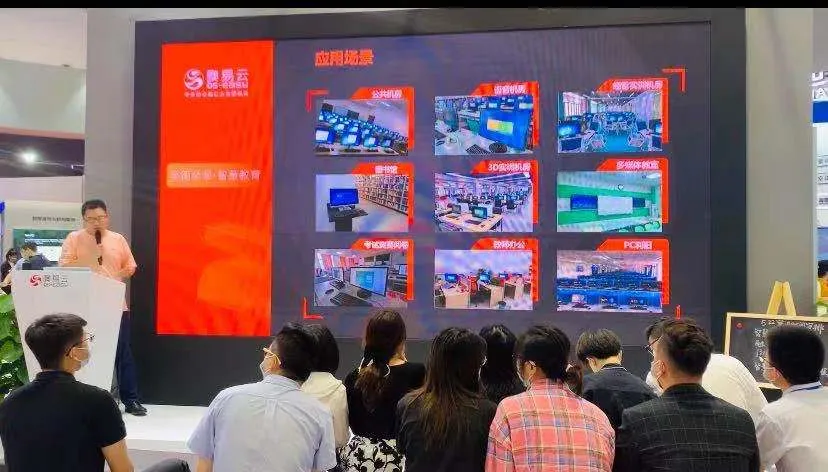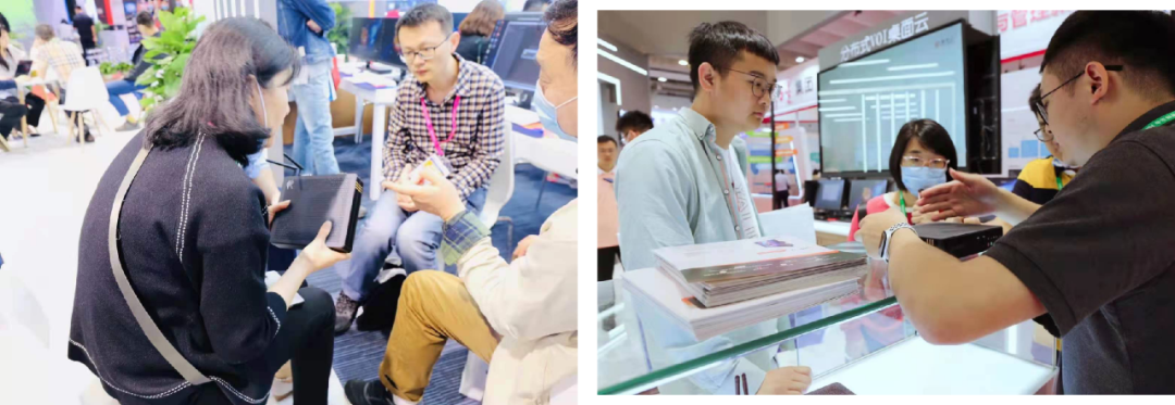 (一批一批老師現(xiàn)場互動交流,了解桌面云技術在公共機房、實訓室、3D機房、多媒體教室等多場景應用)