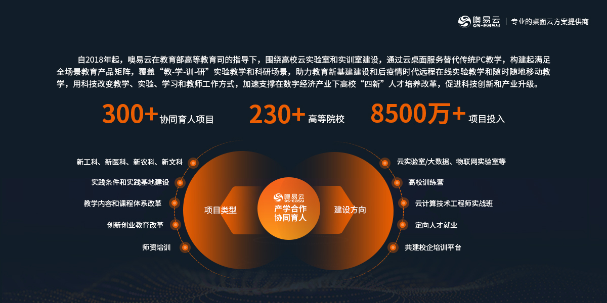 自2018年以來(lái),噢易云在教育部高等教育司的指導(dǎo)下,持續(xù)深化產(chǎn)教融合、產(chǎn)學(xué)合作和協(xié)同育人的指導(dǎo)精神,以產(chǎn)業(yè)轉(zhuǎn)型升級(jí)和創(chuàng)新型人才培養(yǎng)為導(dǎo)向,探索新信息技術(shù)與傳統(tǒng)實(shí)驗(yàn)教學(xué)融合應(yīng)用,圍繞高校云實(shí)驗(yàn)室和實(shí)訓(xùn)室建設(shè),通過(guò)云桌面服務(wù)替代傳統(tǒng)PC教學(xué),提供智能化、全場(chǎng)景的一站式在線教育產(chǎn)品和解決方案,覆蓋“教-學(xué)-訓(xùn)-研”實(shí)驗(yàn)教學(xué)和科研場(chǎng)景,助力教育新基建建設(shè),加速支撐在數(shù)字經(jīng)濟(jì)產(chǎn)業(yè)下高校“四新”人才培養(yǎng)改革,加快構(gòu)建高質(zhì)量高等教育體系。