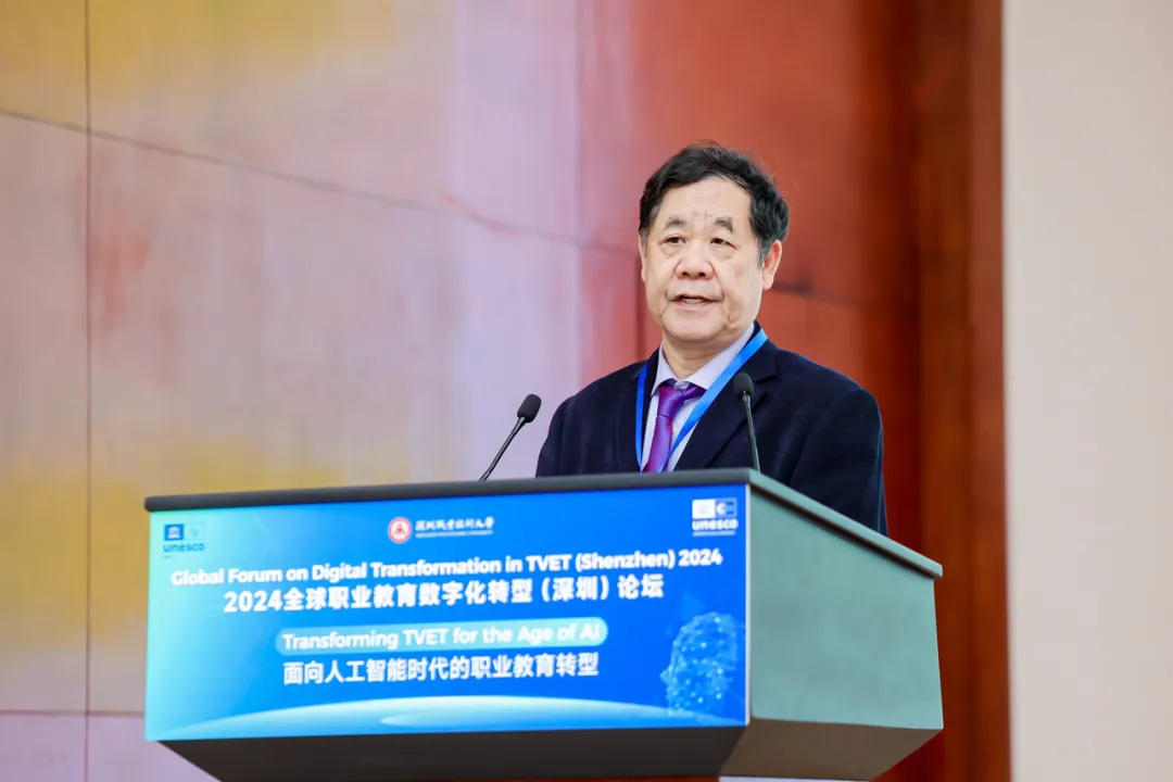 主旨報(bào)告環(huán)節(jié),教席主持人、深職大黨委書(shū)記楊欣斌教授以“新質(zhì)生產(chǎn)力視域下的職業(yè)教育數(shù)字化轉(zhuǎn)型”為主題,詳細(xì)闡述了數(shù)智時(shí)代職教變革的背景、新質(zhì)生產(chǎn)力驅(qū)動(dòng)職教的轉(zhuǎn)型路徑以及深職大數(shù)字化轉(zhuǎn)型的解決方案,為全球職教提供了可借鑒的職教轉(zhuǎn)型理論與案例。