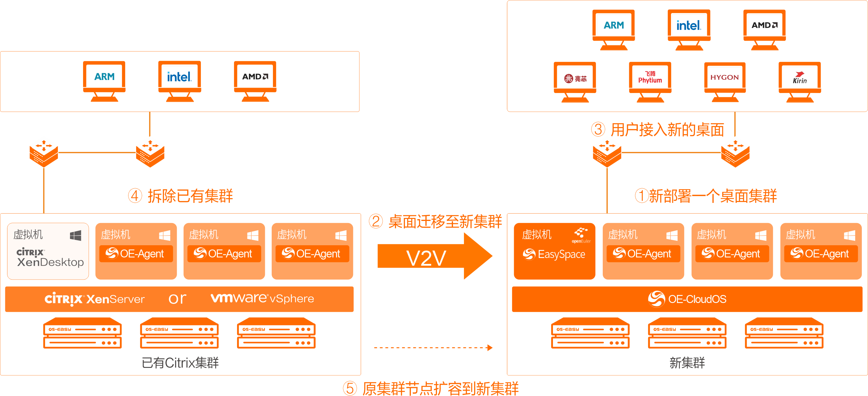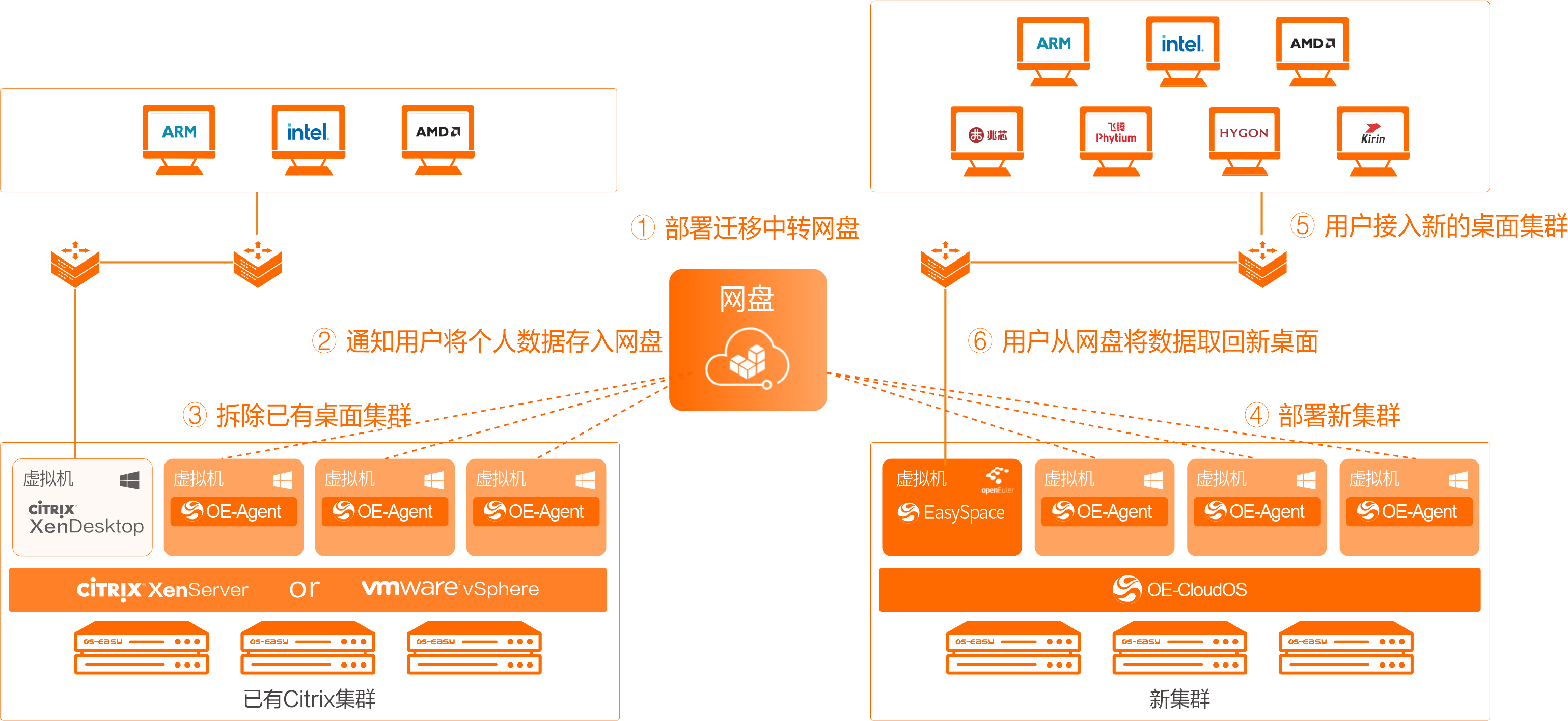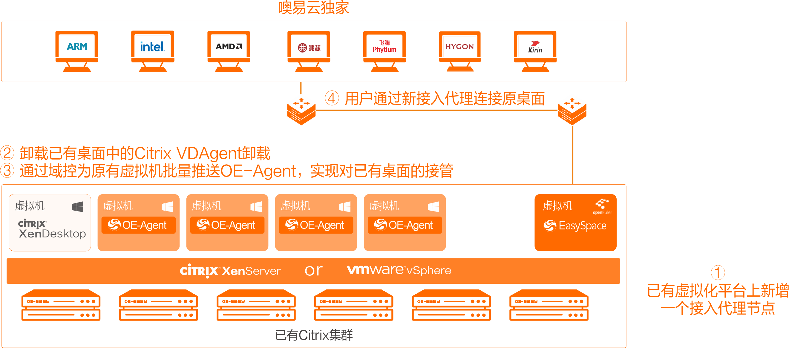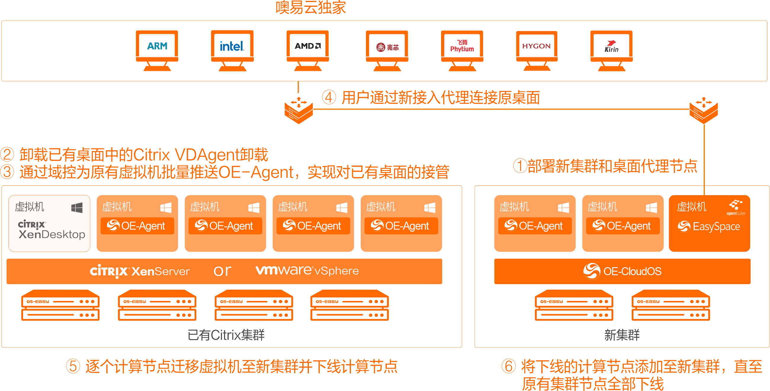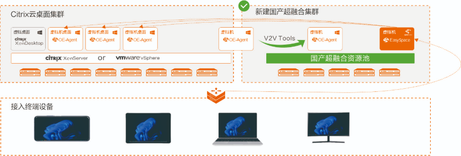 面對由安全事件、信創(chuàng)政策及廠商退出市場共同驅(qū)動的Citrix/VMware替代浪潮,金融及央國企等在保障外包人員安全接入核心業(yè)務(wù)網(wǎng)的關(guān)鍵場景中,正面臨必須實現(xiàn)平滑過渡的戰(zhàn)略需求。為解決此核心痛點,噢易云推出Citrix/VMware桌面替代解決方案,支持僅更換接入?yún)f(xié)議、先換接入?yún)f(xié)議后遷移桌面、僅遷移數(shù)據(jù)、V2V遷移4種遷移方式。通過在已有云計算平臺創(chuàng)建EasySpace虛擬桌面控制臺&接入代理一體化程序,然后再通過域控替換接入代理,將云桌面門戶的登錄域名解析指向EasySpace桌面接入控制臺,實現(xiàn)用戶無感知遷移??杉嫒莸谌降讓犹摂M化平臺,同時云上云桌面方案服務(wù)于業(yè)務(wù)流程,保證內(nèi)部數(shù)據(jù)安全。