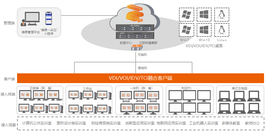 面向職教中心教學(xué)需求,提供融合VDI、VOI、IDV、TCI四種桌面云技術(shù)的云桌面平臺,建設(shè)符合教學(xué)、實驗實訓(xùn)、自主學(xué)習(xí)、考試于一體的多功能融合云實訓(xùn)室,適用于公共計算機(jī)實訓(xùn)室、圖形設(shè)計實訓(xùn)室、財經(jīng)商貿(mào)實訓(xùn)室、創(chuàng)新型實訓(xùn)室(物聯(lián)網(wǎng)/虛擬仿真/工業(yè)機(jī)器人)、多媒體教室、教師辦公、各類考試等大規(guī)模、復(fù)雜混合場景,實現(xiàn)一朵云重構(gòu)實訓(xùn)實踐教學(xué)新空間。