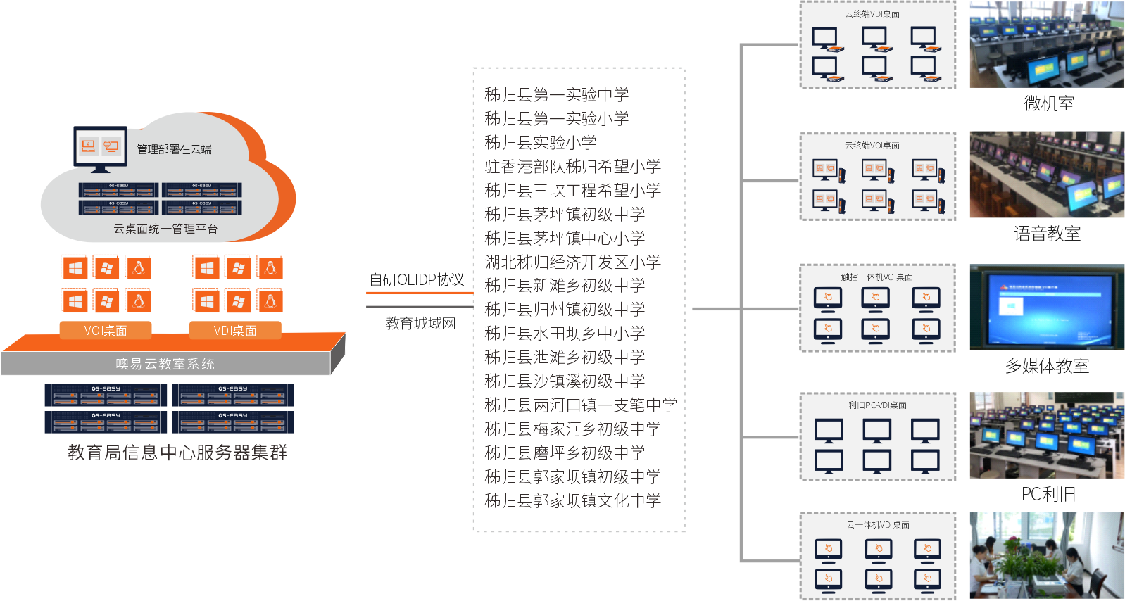 秭歸縣教育局2018年攜手噢易云,通過整體規(guī)劃,分四期建設(shè)了375間多媒體教室、42間計(jì)算機(jī)教室、15間英語口語考試云教室、400臺(tái)教師辦公電腦,共完成3553點(diǎn)云教室系統(tǒng),1572個(gè)云終端,6000多套云桌面系統(tǒng)的實(shí)施與交付。通過多架構(gòu)桌面云融合技術(shù),實(shí)現(xiàn)教學(xué)各場景和教師辦公桌面的云化,實(shí)現(xiàn)云端統(tǒng)一交付、更新和管理,區(qū)校一體化融合服務(wù)。