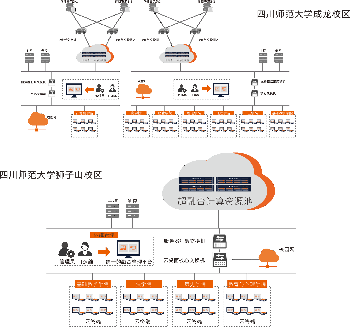 四川師范大學(xué)是四川省屬重點(diǎn)大學(xué)、國家首批“中西部高校基礎(chǔ)能力建設(shè)工程”實(shí)施高校,是四川省舉辦本科師范教育最早、師范類院校中辦學(xué)歷史最為悠久的大學(xué)。在信息化教學(xué)和云計(jì)算技術(shù)越來越普及的趨勢下,四川師范大學(xué)逐步把計(jì)算機(jī)科學(xué)/基礎(chǔ)教學(xué)機(jī)房、商學(xué)院機(jī)房、物理電子學(xué)院多媒體教室、法學(xué)院機(jī)房、教育學(xué)院機(jī)房全部遷移上云。采用噢易融合桌面云解決方案,共部署2200點(diǎn)融合桌面云,2200臺云終端,覆蓋34間云實(shí)驗(yàn)室,服務(wù)于獅子山校區(qū)和成龍校區(qū)的10個學(xué)院,累計(jì)為10萬+師生提供穩(wěn)定安全高效的教學(xué)和辦公環(huán)境。