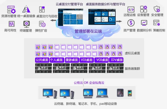 多桌面融合架構(gòu),滿足發(fā)展需求,超大規(guī)模集群支持、桌面鏡像分層技術(shù)、具備更廣泛的兼容性、多架構(gòu)桌面統(tǒng)一模板、超融合架構(gòu),自由擴展、交付VDI、VOI、IDV三種架構(gòu)的桌面,滿足所有場景應(yīng)用需求。