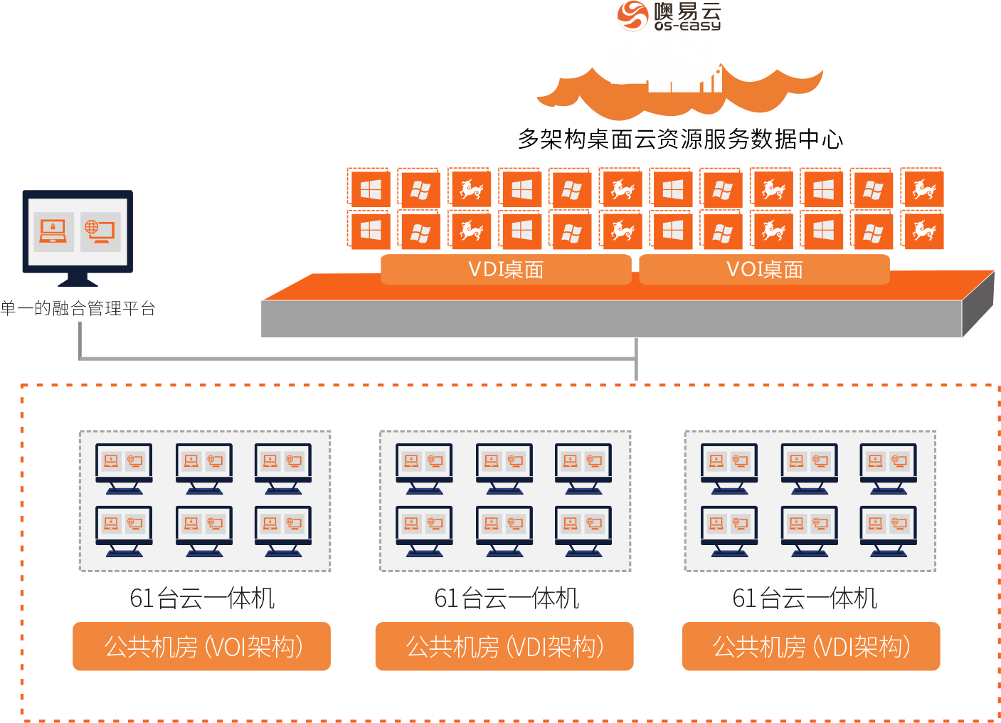 學校計算機機房分別部署120點VDI架構的桌面云和63點VOI架構的桌面云。通過單一的融合管理平臺交付VDI、VOI桌面,對不同架構的云桌面系統(tǒng)進行統(tǒng)一部署、管理和運維。