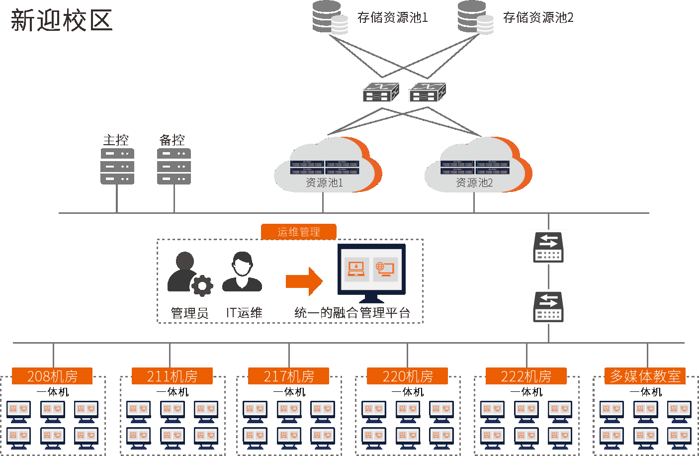 昆明理工大學在以往的計算機教室建設中,投入了大量資金,但由于PC生命周期短,配置變更管理復雜,造成極大的資源浪費。學校在后期的建設中期望將硬件設備完整使用至物理壽命,從而減少資金投入,并且利用桌面云技術,打造資源池模式,實現(xiàn)硬件資源的靈活調整分配。