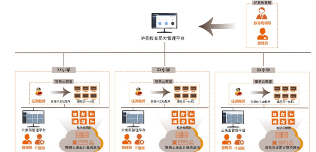 四川省瀘州市瀘縣教育局,響應(yīng)國(guó)家信息化建設(shè)號(hào)召,經(jīng)研究討論后決定采用云桌面的建設(shè)模式,滿(mǎn)足教育局管轄范圍內(nèi)學(xué)校的教學(xué)使用,降低學(xué)校的管理運(yùn)維難度,有助于改進(jìn)薄弱學(xué)校信息化建設(shè),讓學(xué)生教學(xué)環(huán)境與高教實(shí)現(xiàn)接軌。因此對(duì)19所學(xué)校進(jìn)行了云桌面建設(shè),讓虛擬化技術(shù)融入校園生活。