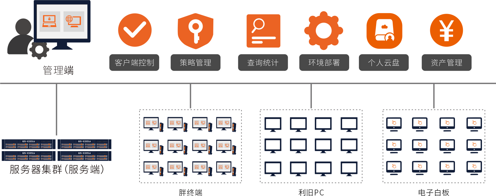 提供多期建設(shè)方案,桌面云平臺支持設(shè)備異構(gòu)且老設(shè)備與新設(shè)備共存,一期建設(shè)全新的桌面云機(jī)房,二期將多媒體教室電子白板、智慧黑板等設(shè)備利舊,現(xiàn)有教學(xué)終端全部納入噢易云教室系統(tǒng)統(tǒng)一管理。