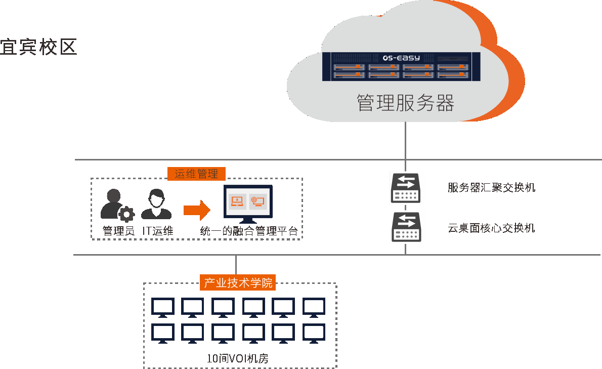 通過噢易融合桌面云管理平臺按照各大學(xué)院的使用需求以及教學(xué)終端的類型,分別交付VDI、VOI架構(gòu)云桌面系統(tǒng),對不同架構(gòu)的云桌面系統(tǒng)進行統(tǒng)一部署、管理和運維,實現(xiàn)一朵云跨學(xué)院管理所有教學(xué)終端。