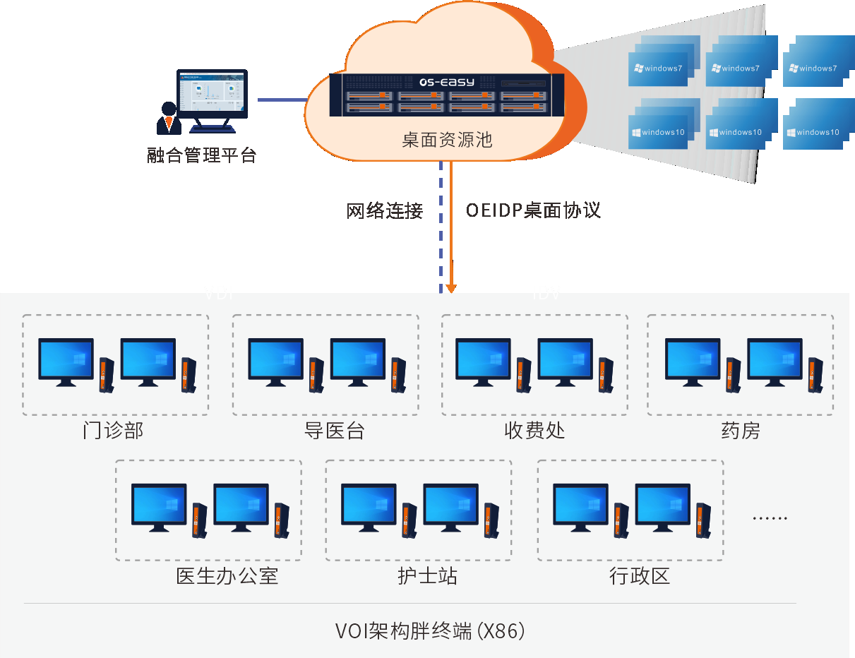 - 一朵云,覆蓋門診部、導(dǎo)醫(yī)臺、藥局、醫(yī)生辦公室、護士站、行政區(qū)醫(yī)療全場景桌面應(yīng)用需求