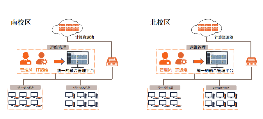 廣州市輕工技師學(xué)院共建設(shè)256點(diǎn)VDI架構(gòu)桌面云、289點(diǎn)VOI架構(gòu)桌面云,五期建設(shè)實(shí)現(xiàn)不同架構(gòu)的桌面云統(tǒng)一、遠(yuǎn)程的管理與運(yùn)維;解決大規(guī)模、復(fù)雜、混合場景分批建設(shè),統(tǒng)一管理的問題,打造一站式服務(wù)管理平臺。