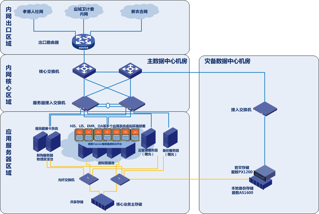 采用主備存儲搭建模式,當主存儲故障后,備份存儲能自動接管應(yīng)用資源,達到應(yīng)用備份的目的,同時通過虛擬化一體備份軟件,將業(yè)務(wù)數(shù)據(jù)、系統(tǒng)數(shù)據(jù)、管理數(shù)據(jù)、整體備份到異地遠端,增加主機房災難情況下的數(shù)據(jù)安全。