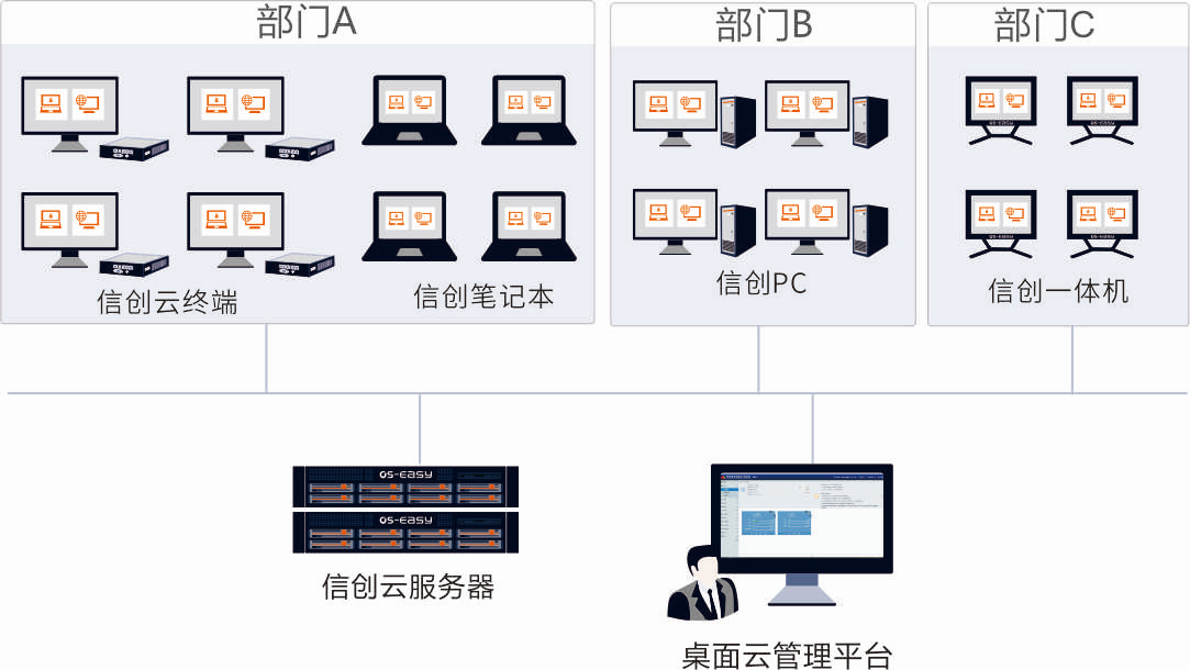 采用信創(chuàng)桌面云平臺構建“云服務器-云桌面-云終端”的新型云辦公形態(tài),銜接傳統(tǒng)的辦公及應用模式,對終端、桌面與應用進行統(tǒng)一管理與維護;通過雙網(wǎng)隔離方案,解決行政辦公場景下存在的多套網(wǎng)絡訪問需求;同時數(shù)據(jù)集中上云存儲,有效防止敏感數(shù)據(jù)泄漏;利用云應用方案,實現(xiàn)已改造應用和未改造應用的“雙軌運行”,促進終端信息化向國產(chǎn)自主可控方向遷移,有效支撐日常辦公及移動協(xié)同等需求。