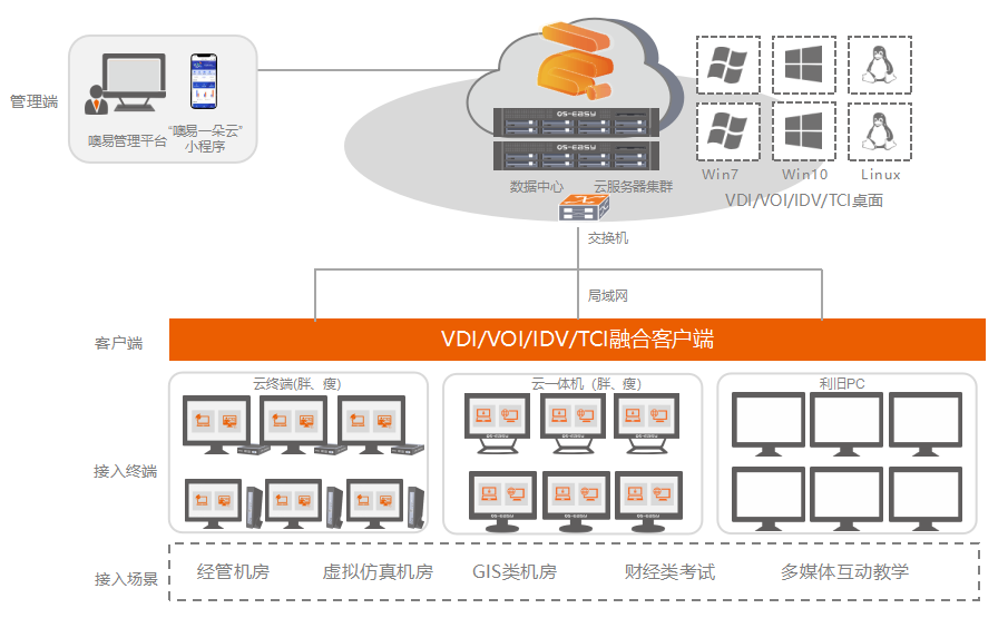 面向經(jīng)管專業(yè)的課程實(shí)踐性強(qiáng)、應(yīng)用軟件創(chuàng)建賬套、創(chuàng)業(yè)實(shí)訓(xùn)比賽多等需求,提供融合VDI/VOI/IDV/TCI四種桌面云技術(shù)的云桌面平臺(tái),建設(shè)符合教學(xué)、實(shí)驗(yàn)實(shí)訓(xùn)、自主學(xué)習(xí)、考試于一體的云實(shí)驗(yàn)室,適用于國(guó)際經(jīng)濟(jì)與貿(mào)易、工商管理、電子商務(wù)、財(cái)務(wù)管理、物流管理、金融學(xué)等專業(yè)場(chǎng)景,滿足各專業(yè)基礎(chǔ)性實(shí)驗(yàn)、綜合性實(shí)驗(yàn)、研究探索型實(shí)驗(yàn)的應(yīng)用需求。