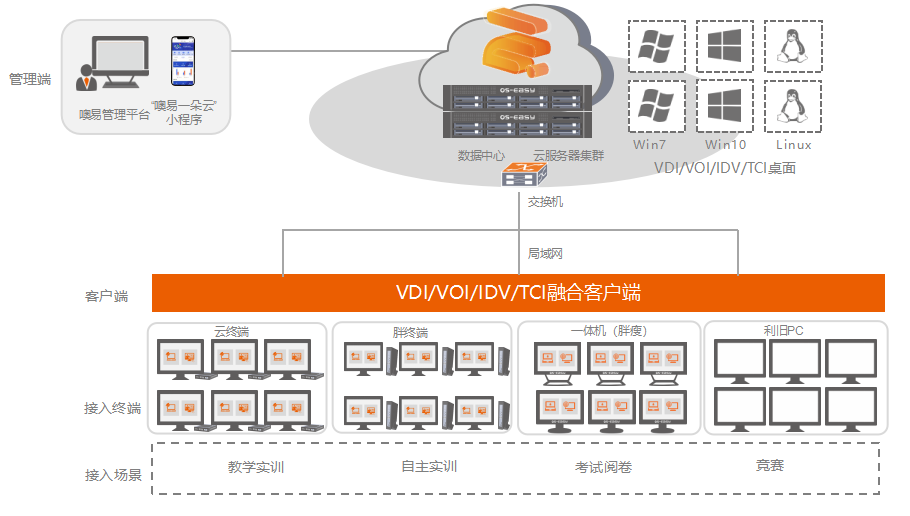 面向計算機公共實訓(xùn)室,構(gòu)建以動手能力為主的IT基礎(chǔ)環(huán)境,采用融合桌面云技術(shù),按需交付實驗實訓(xùn)、學(xué)生自主訓(xùn)練、考試競賽所需的教學(xué)應(yīng)用系統(tǒng)和環(huán)境,通過?致的Web視圖界面,實現(xiàn)機房、設(shè)備、桌面的統(tǒng)一管理和集中運維。