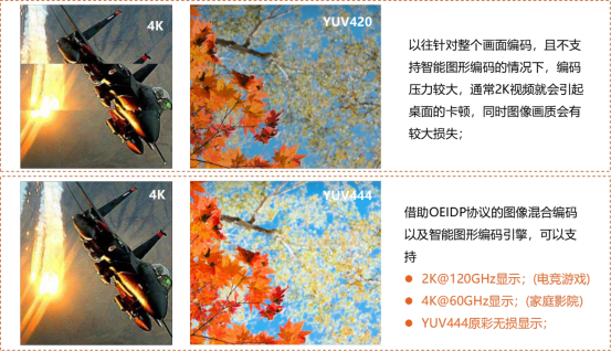 2、分辨率:傳統的Spice協議最大分辨率支持1080P,OEIDP桌面?zhèn)鬏攨f議最大分辨率可支持到4K@60GHz,能夠滿足電競游戲、家庭影院以及YUV444原彩無損顯示需求。