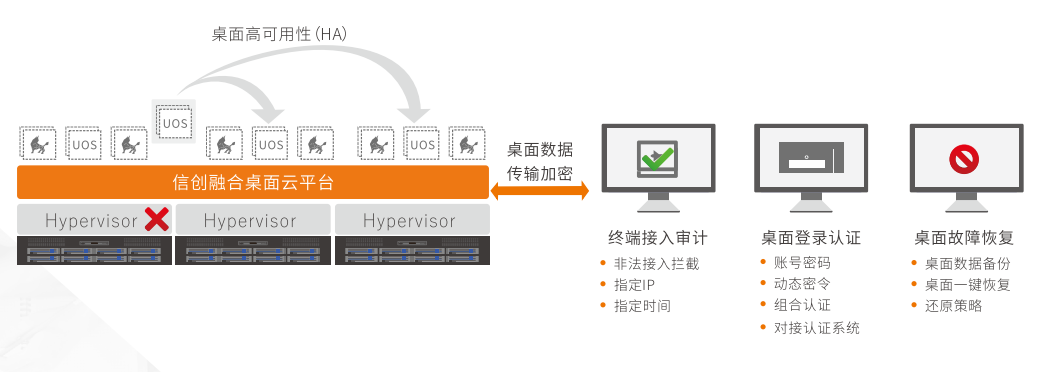 桌面云平臺數(shù)據(jù)安全訴求:桌面數(shù)據(jù)傳輸過程確保安全、不被竊??;桌面數(shù)據(jù)防丟失、防泄露;桌面云系統(tǒng)故障后,快速恢復(fù)系統(tǒng),保障業(yè)務(wù)連續(xù)性。