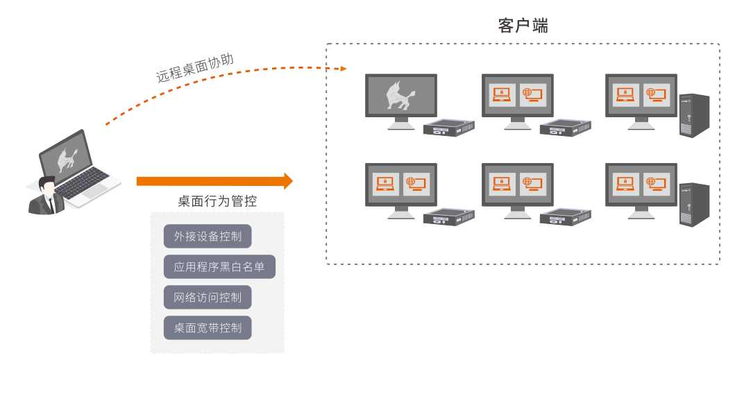 建立桌面安全管控規(guī)則,對全域終端設(shè)備和桌面環(huán)境統(tǒng)一管控,支持遠(yuǎn)程接入所有大規(guī)模、分散異構(gòu)的終端,對桌面行為進(jìn)行監(jiān)控、審計和管理,規(guī)范桌面行為,確保資源合理利用。