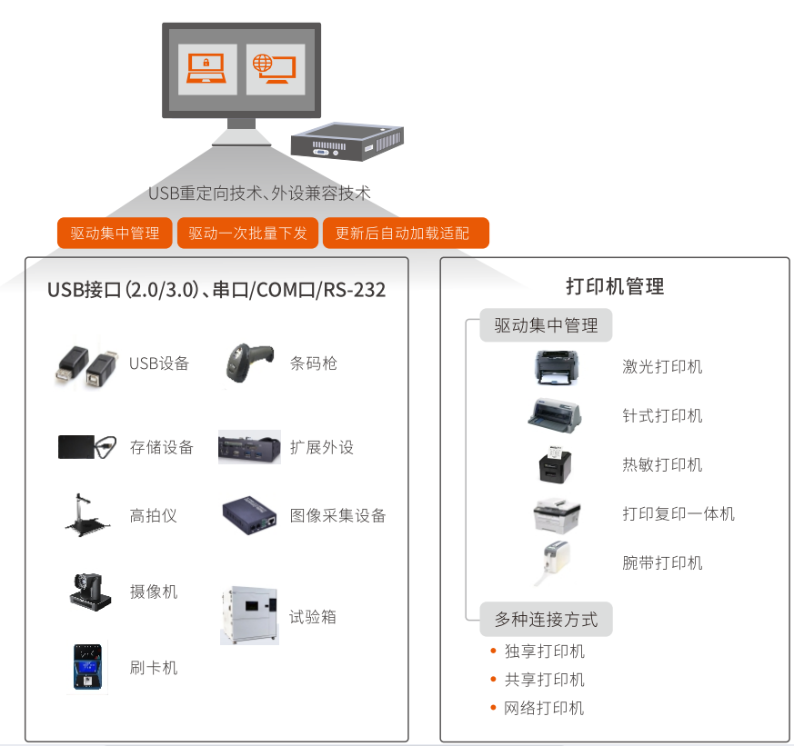 工作中經(jīng)常連接如USB、打印機(jī)、讀卡器、各類身份識別設(shè)備等外接設(shè)備,使用方式、兼容性各不一樣,導(dǎo)致經(jīng)常存在不可用的現(xiàn)象,影響工作效率。平臺支持外設(shè)驅(qū)動集中管理、打印機(jī)批量管理。