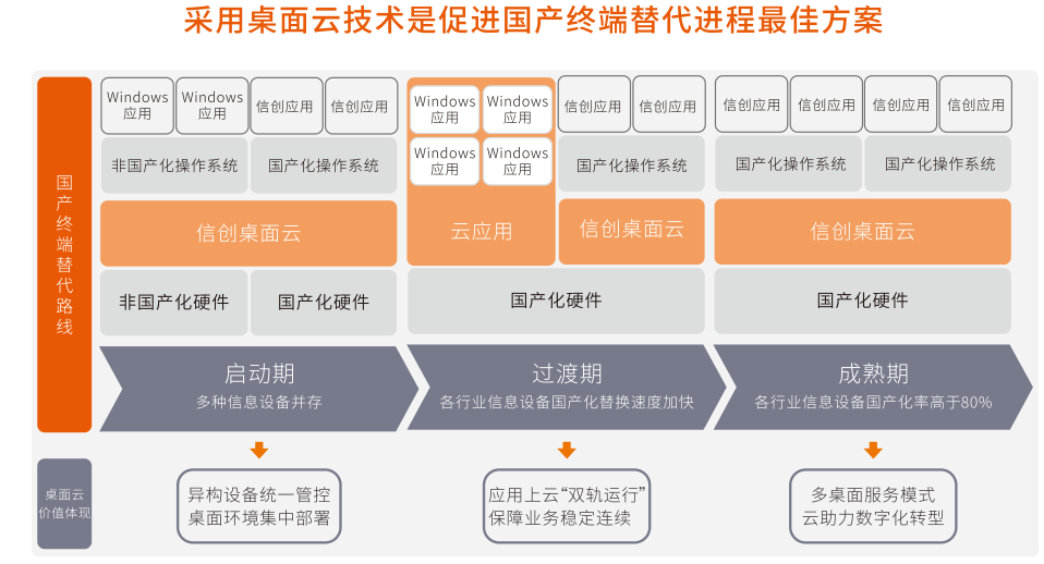 在“國產(chǎn)自主可控“政策的推動下,對各行業(yè)用戶終端信息化系統(tǒng)建設(shè)來說,采用可信桌面云平臺構(gòu)建“服務(wù)器-桌面云-終端”的云辦公業(yè)務(wù)模式,不僅銜接現(xiàn)有傳統(tǒng)的辦公及應(yīng)用模式,對終端設(shè)備、桌面環(huán)境進(jìn)行統(tǒng)一管理維護(hù),還能促進(jìn)信息化系統(tǒng)向國產(chǎn)自主可控方向遷移,有效支撐日常辦公及移動協(xié)同等信息化需求。終端系統(tǒng)國產(chǎn)化是一個長期過程,需經(jīng)歷啟動期、過渡期、成熟期三個階段。