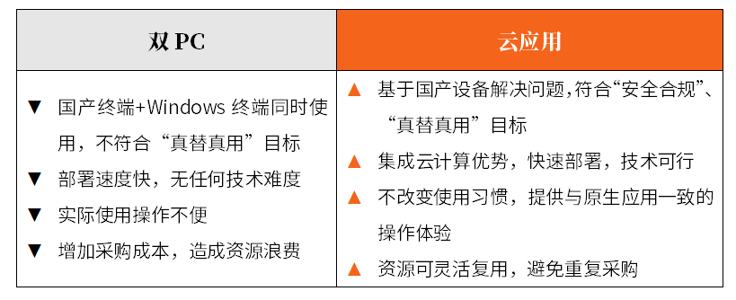 1、雙PC:多置辦1臺Windows操作系統(tǒng)終端單獨辦公。該方法部署速度快,無技術(shù)難度,但辦公人員需同時操作2臺電腦進行辦公,影響工作效率。且該方法未能改變受制于人的現(xiàn)狀,難以實現(xiàn)技術(shù)自主,不符合“真替真用”目標。