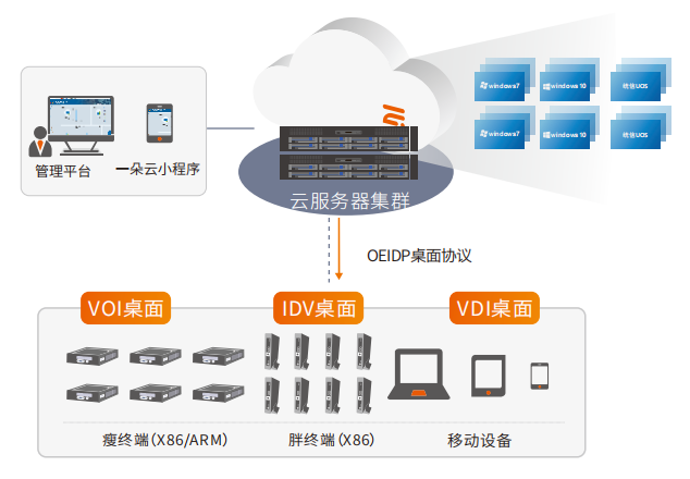 噢易云電腦是一套融合了VDI/VOI/IDV/TCI三種桌面架構(gòu)的新型桌面云產(chǎn)品。由云服務(wù)器組成集群,根據(jù)辦公場(chǎng)景特性,以及用戶資源配置規(guī)格需求的不同,跨終端設(shè)備(瘦終端、胖終端、利日PC、移動(dòng)設(shè)備)按需交付不同架構(gòu)桌面。—朵云,覆蓋行業(yè)全場(chǎng)景桌面應(yīng)用需求,構(gòu)建高安全、高穩(wěn)定的IT融合新架構(gòu)、釋放靈活、易擴(kuò)展、移動(dòng)的數(shù)字化工作空間。