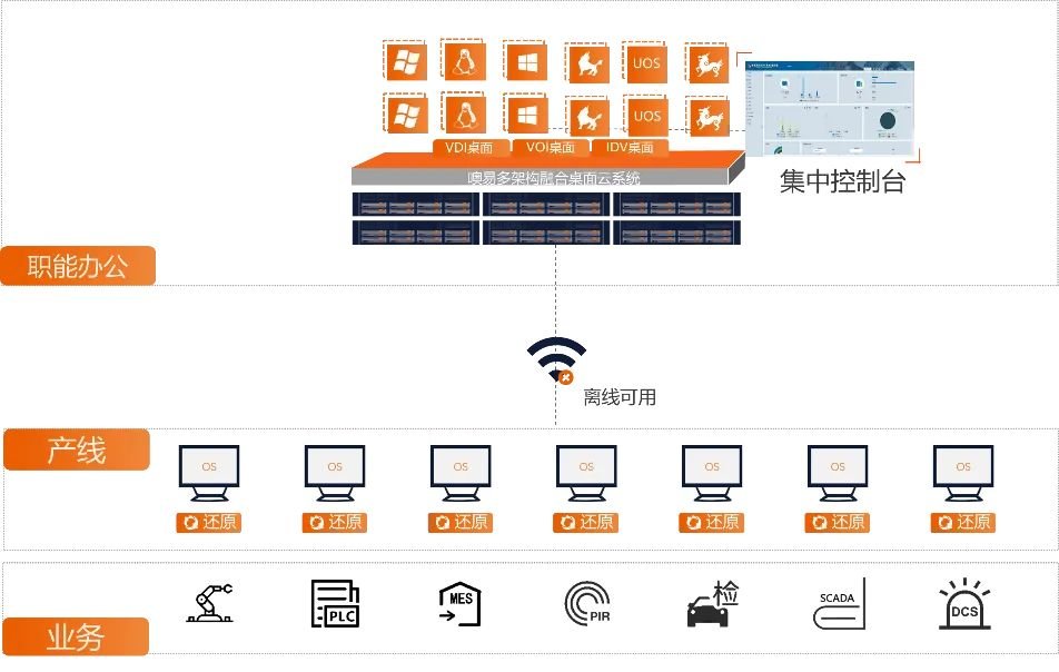 噢易生產(chǎn)制造云辦公解決方案,以VOI架構(gòu)為基礎(chǔ),提供強大故障恢復的還原保護等功能模塊,還能有效地防御各種病毒木馬,有效終端運行健康狀態(tài),高效管理原有終端及復雜外部設(shè)備,可以降低運營成本、節(jié)能減排、提高管理效率及安全性。