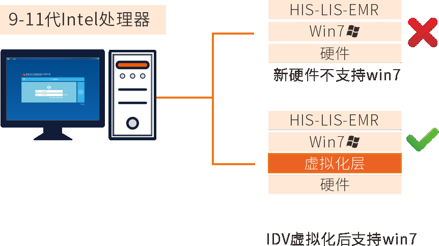針對(duì)9-11代Intel新平臺(tái)不能直接安裝Win7系統(tǒng)問(wèn)題,通過(guò)IDV架構(gòu)保障終端與HIS業(yè)務(wù)系統(tǒng)完美兼容,基于融合模板統(tǒng)一管理,不同架構(gòu)終端基于同一個(gè)鏡像模板編輯使用。